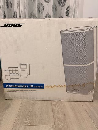 Sistema di altoparlanti Bose Acoustimass 10. - Design elegante e compatto. - Colore nero. - Marchio Bose ben visibile. il sistema è composto da sub e 5 satelliti composti da doppio cibo includo la cavetteria 2 stand per i frontali e 2 staffe a muro per le posteriori.