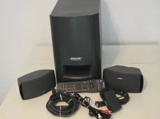 Sistema audio Bose CineMate per un'esperienza cinematografica a casa. Include subwoofer e due altoparlanti. Telecomando incluso. Cavi di connessione.