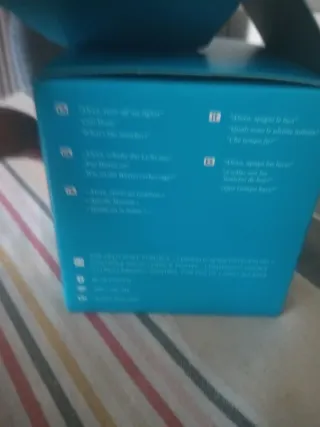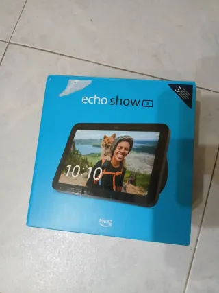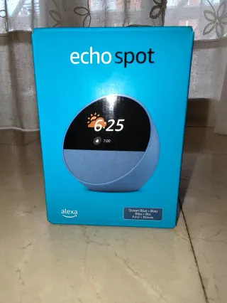 Amazon Alexa Echo Spot. La prima versione. Questo modello non è più venduto nei negozi ufficiali. Questa prima versione ha una fotocamera integrata e consente videochiamate e visualizzazione di video, caratteristiche che la nuova versione non ha. Dispone di Alexa, Bluetooth, Wi-Fi e uscita audio da 3,5 mm. Permette di controllare dispositivi (luci HUE, termostato NETAMO...) e utilizzare servizi (Spotify, rtve, El País...) con la voce. È stato ripristinato alle impostazioni di fabbrica.