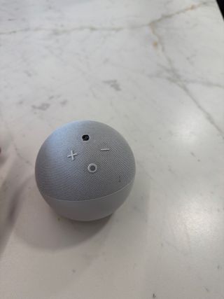 Smart speaker di forma sferica, dal design moderno e compatto. Perfettamente funzionante e resettato per essere configurato con l'app di alexa senza pin o password di blocco. Alimentatore incluso. - Finitura in tessuto bianco ghiaccio. - Pulsanti fisici sulla parte superiore per il controllo.