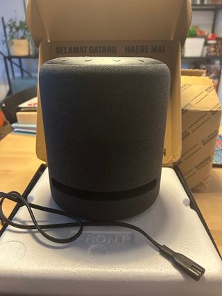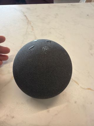 Altoparlante intelligente Amazon Alexa in colore grigio. Il suo design compatto e sferico si adatta a qualsiasi spazio. - Copertura in tessuto. - Pulsanti di controllo nella parte superiore. Manca la gomma di un pulsante ma funziona perfettamente, ecco perché il prezzo