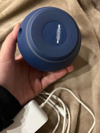 Altoparlante intelligente Alexa Echo Dot in colore blu. Include il suo caricabatterie. Design sferico moderno. Pulsanti di controllo nella parte superiore. Porta di carica nella parte posteriore.