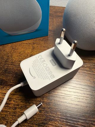 Altoparlante intelligente Amazon Echo Dot di 5ª generazione in grigio. Include il suo caricabatterie. Design sferico. Pulsanti touch nella parte superiore. Presenta una piccola macchia.
