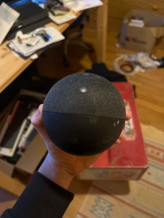 Altoparlante intelligente Echo Dot di quinta generazione in colore grigio. Come nuovo, quasi mai usato, acquistato a maggio 2025 - Design sferico. Parte superiore con pulsanti touch.