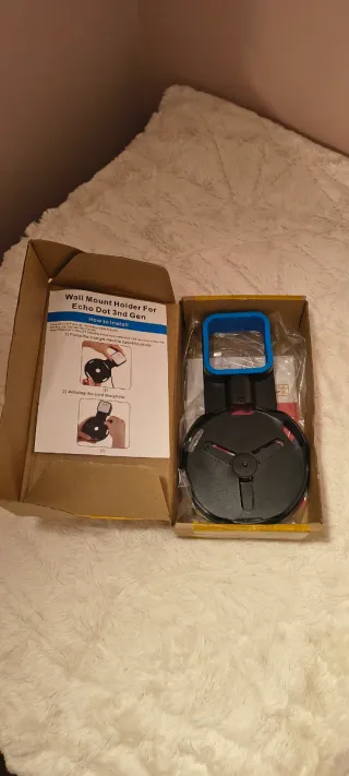Supporto da parete progettato per l'Amazon Echo Dot di 3ª generazione. Permette un'installazione discreta e sicura. Colore nero con dettagli in blu. Include istruzioni di montaggio.