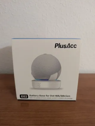 Base portatile del marchio PlusAcc progettata per Amazon Echo Dot di 4ª e 5ª generazione. Permette di utilizzare il dispositivo senza cavi. Modello E02. Indicatori LED di carica. Porta di carica USB-C.