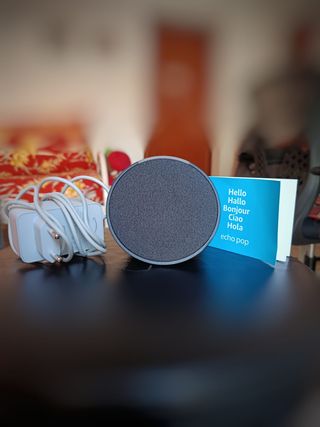 Altoparlante intelligente Echo Pop, nuovo e pronto all'uso. Design compatto e moderno. Integrazione con Alexa.