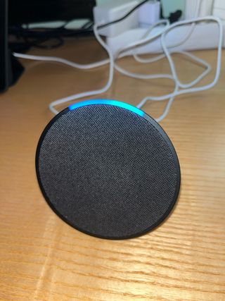 Altoparlante intelligente Amazon Echo Pop in colore blu. Include caricabatterie. Design compatto e moderno. Suono nitido per musica e assistenti vocali. Usato pochissimo.