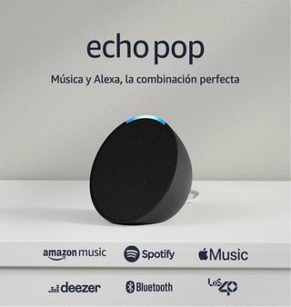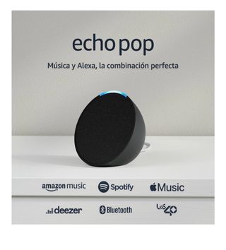 Altoparlante intelligente Amazon Echo Pop in colore nero. Goditi la musica e Alexa. Compatibile con Amazon Music, Spotify, Apple Music e Deezer. Connettività Bluetooth. Se desideri Alexa + lampadina intelligente +10€. Se desideri Alexa + presa intelligente +10€.
