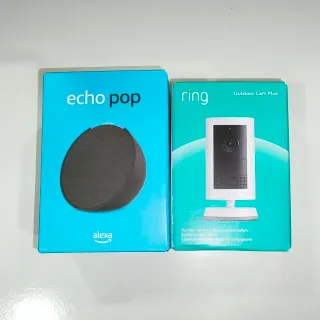 Nuovo e sigillato. In vendita insieme l'altoparlante intelligente Echo Pop con Alexa e la telecamera di sicurezza Ring Outdoor Cam Plus. - Altoparlante intelligente Echo Pop con Alexa. - Telecamera di sicurezza Ring Outdoor Cam Plus. - Telecamera per esterni con batteria ricaricabile.