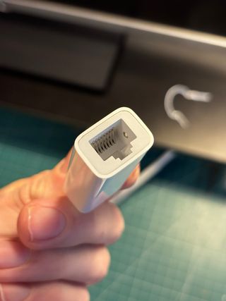 Adattatore di marca Apple per connettere il dispositivo a una rete Ethernet tramite Thunderbolt. - Connessione Thunderbolt. - Porta Ethernet RJ45.