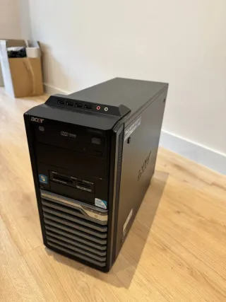 Computer desktop Acer in colore nero e grigio. Include unità DVD. Non include dischi rigidi. Senza sistema operativo. Porte USB frontali. Lettore di schede. Processore Intel Pentium. 8 GB di RAM.