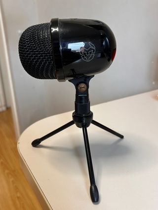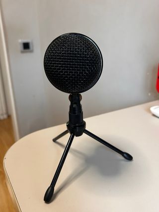 Microfono da tavolo con design moderno e compatto. Ideale per registrazioni o comunicazione. Manca un cerchio su una gamba ma si regge perfettamente. - Base a treppiede stabile. - Griglia protettiva metallica. - Finitura lucida. - Include cavo USB