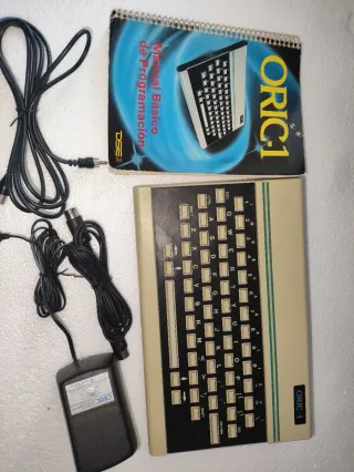 Computer Oric-1 con il suo manuale di programmazione di base, tastiera funzionante, include cavo video, cavi per cassette e alimentatore. Altri dispositivi nel mio profilo.
