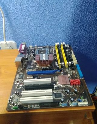 Scheda madre per computer della marca ASUS, stile gaming per PC desktop Windows, con due porte PCI Express per scheda grafica, utilizza processore Intel Core 2 Duo. Include: socket per processore, slot per memoria RAM, connettori di espansione PCI e PCIe, porte di connessione posteriori.