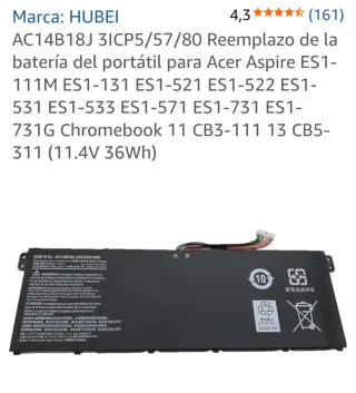 Batteria di ricambio per laptop Acer Aspire e Chromebook. Modello: AC14B18J (3ICP5/57/80). Voltaggio: 11.4V. Capacità: 36Wh. Compatibile con Acer Aspire ES1-111M, ES1-131, ES1-521, ES1-522, ES1-531, ES1-533, ES1-571, ES1-731, ES1-731G, Chromebook 11 CB3-111, CB5-311.
