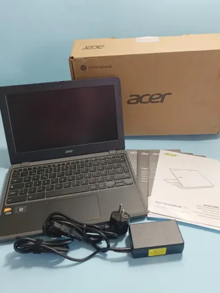 Chromebook Acer 311 in colore nero, ideale per attività quotidiane e navigazione web. Include la scatola originale e gli accessori. - Portatile Chromebook. - Caricabatterie. - Manuali e guida alla configurazione.