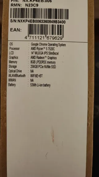 Chromebook in ottime condizioni con pochissimo utilizzo. Regalo, uso normalmente il desktop. MODELO: CB514-3H-R88J S.O: Google Chrome Processore: AMD Ryzen 5 7520C Schermo: 14" WUXGA IPS SlimBezel Memoria: 8GB Archiviazione: 256GB PCIe NVMe SSD Connettività: WIFI6E e BLUETOOTH Batteria: 53 Wh Li-ion