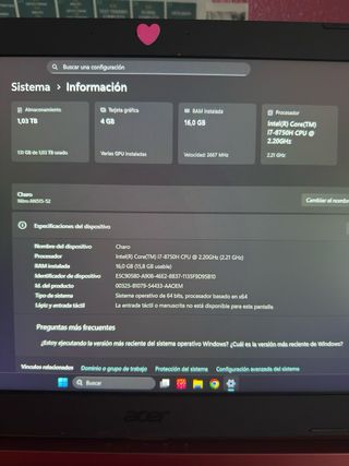 Portátil Acer Nitro 5 con processore i5-10300h 4n/8p 4.40ghz, 16GB di RAM e SSD da 500GB. - Schermo FullHD IPS da 16'' a 144Hz. - Scheda grafica GTX1650 4gb gdd. - Tastiera retroilluminata in rosso. - Windows 11. - Caricatore originale e batteria perfetta. - Formattato e pasta termica sostituita.