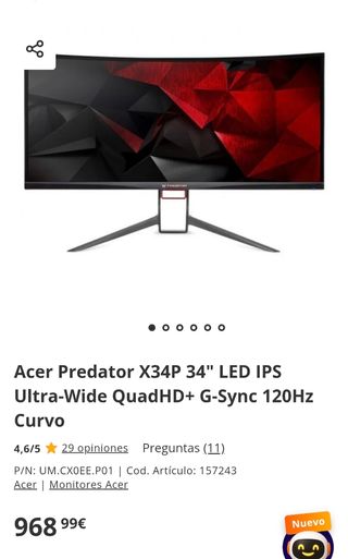 🚨 Opportunità Unica 🚨 Monitor Gaming Acer Predator X34 UltraWide Curvo 34" (3440x1440 UQHD). Prezzo imperdibile: 300€ (Nuovo costava 1800€). Posizione: Guadalajara. Ideale per gaming esigente e design professionale. Caratteristiche Top: Frequenza: 100Hz (OC) Tecnologia: G-Sync Pannello: Curvo AH-IPS Colore: 100% sRGB Ha luci sotto che cambiano colore e modalità. Può mostrare i fps e aggiunge una mira allo schermo per giochi che non ce l'hanno. Supporta DisplayPort e HDMI. Dettagli estetici minimi che non influenzano le prestazioni (da qui il prezzo): 1 pixel danneggiato (a malapena visibile) e manca una lettera sull'adesivo.
