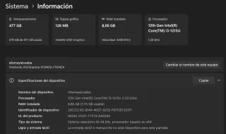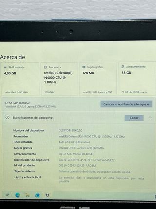 In buone condizioni, presenta alcuni segni d'uso, normali nel tempo, ha la tastiera italiana ma può essere configurata in spagnolo. Archiviazione 238 GB, scheda grafica 128 MB, 8 GB RAM, processore Intel i5 di 11ª generazione. Non include il caricabatterie.