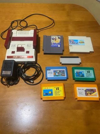 Console Family Computer con adattatore e 15 giochi. - Include una console. - Adattatore di alimentazione + cavo antenna - 6 cartucce di gioco: - Double Dragon 2 - Jackie Chan Action Kung Fu - Super Mario Bros. - Donkey Kong - Città di battaglia - Campione urbano - Kung Fu - Combattimento in mongolfiera - Lotta - Praise Runner - Chack'n Pop - Pacman - Galaga -Ice Climber