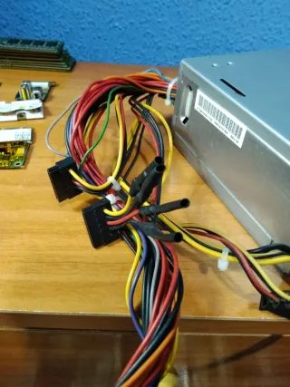 Alimentatore per PC con molteplici cavi. Per computer desktop Windows - Custodia metallica argentata. Connettore di alimentazione standard. Cavi di vari colori per la connessione.