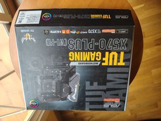 Scatola della scheda madre ASUS TUF Gaming X670E-Plus. Modello: X670E-PLUS. Supporto per AMD Ryzen. Compatibile con PCIe 5.0. Memoria DDR5. Tecnologia DTS HDMI.