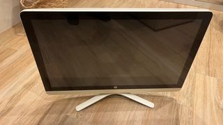 Computer desktop HP con un design elegante e moderno. Colore bianco. Base con un design curvo distintivo.