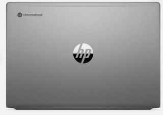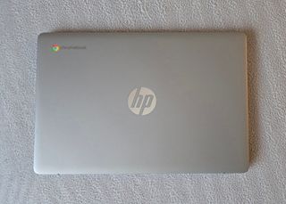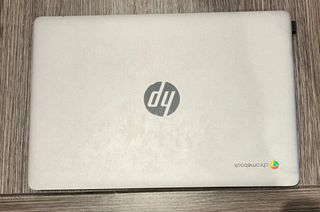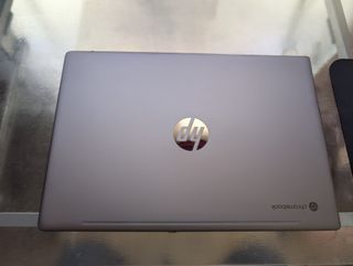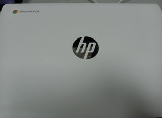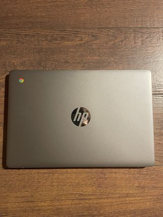Chromebook HP in perfette condizioni. Caricabatterie non originale. Design elegante e moderno. Logo HP sul coperchio. Indicazione 'Chromebook' con logo Google.