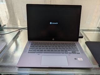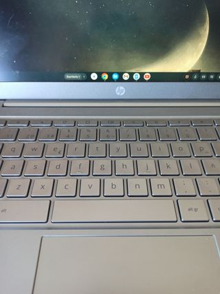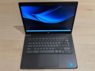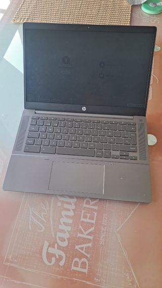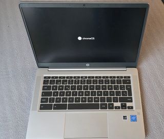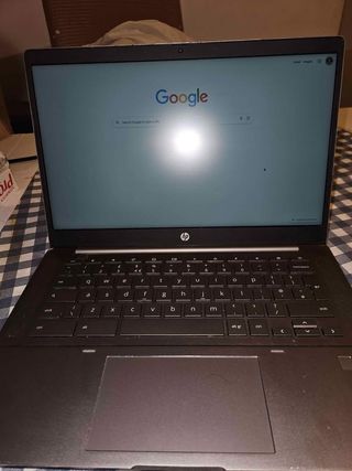 Chromebook HP 14" ricondizionato, ripristinato alle impostazioni di fabbrica. Manca la barra spaziatrice, facile da raggiungere, anche se funziona.