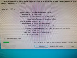 Computer desktop HP Compaq dx2400 Microtower PC. - Processore: Pentium(R) Dual-Core CPU E5200 @ 2.50GHz (2 CPUs), ~2.5GHz - Memoria: 4096MB RAM - Sistema operativo: Windows 10 Pro 64 bit - Versione DirectX: DirectX 12 Hdd 240 GB