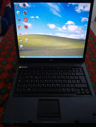 Portatile HP in colore grigio. Design classico e funzionale. Logo del marchio visibile sul coperchio. Con Windows XP. Completamente funzionale. La batteria non so come sarà, ma ha lettore di dischi, schede PCMCIA, WiFi, Bluetooth...