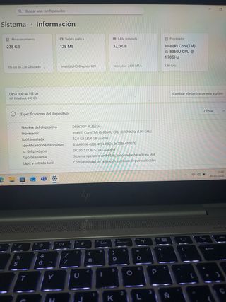 Portatile HP EliteBook 840 G5 in ottime condizioni. Processore: Intel Core i5-8350U (1.9GHz). Memoria RAM: 32 GB DDR4. Archiviazione: SSD da 256 GB. Schermo: 14 pollici antiriflesso. Sistema operativo: Windows 11 Pro 25H2 con pacchetto Office attivato e aggiornato. Connettività: USB 3.0, VGA, DisplayPort, ethernet, lettore SD. Tastiera spagnola retroilluminata, WiFi, Bluetooth, webcam, lettore di impronte digitali, schermo touch e Face ID. Batteria in buono stato. Include caricabatterie originale HP. Molto curato, poco uso. Possibilità di spedizione o consegna a mano.