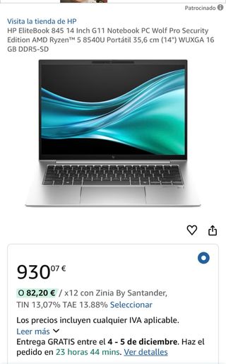Portatile HP 845 G11, con AMD Ryzen 7 8840U con grafica Radeon 780M. 32GB RAM DDR5-5600MHz. Storage NVMe da 1TB. Tastiera retroilluminata. Fotocamera con otturatore per la privacy. Ancora in garanzia. Schermo Full HD da 14''. Windows 11 Pro. Batteria: 2 cicli. Tastiera spagnola (ES) con Ñ senza adesivi o verniciatura. Connettività completa: 2x USB-C Thunderbolt 4, HDMI 2.1, 2x USB-3.2, jack per cuffie. Bluetooth 5.3. Caricabatterie originale. Utilizzato 1 mese. Wi-Fi 6E (802.11ax). Come nuovo, usato molto poco (cicli batteria), in perfette condizioni senza segni.