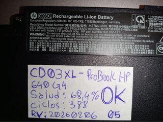 Batteria di ricambio per portatile HP. Modello: CD03XL. Compatibile con ProBook 640 G4. Capacità: 68,4%. Ciclos: 388. Data di produzione: 20260206. Scatola75. Compatibile con CS03XL e i seguenti dispositivi: HP EliteBook 745 (G3 / G4), HP EliteBook 755 (G3 / G4), HP EliteBook 840 (G3 / G4), HP EliteBook 848 G3, HP EliteBook 850 (G3 / G4), HP ZBook 15u (G3 / G4), HP MT42 / MT42. Si vende in questo stato, non posso garantire il funzionamento su nessuno dei portatili per cui è stata ottenuta la batteria.