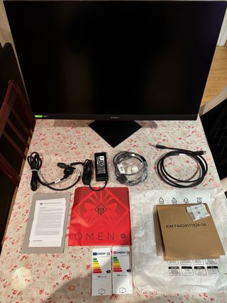 Monitor da gioco HP Omen da 27 pollici con risoluzione 2K e alta frequenza di aggiornamento. Pannello IPS per colori vivaci e ampi angoli di visione. Frequenza di aggiornamento di 165Hz per un'esperienza di gioco fluida. Compatibile con HDR per un maggiore contrasto e dettaglio. Include scatola originale, cavi e adattatore di alimentazione.