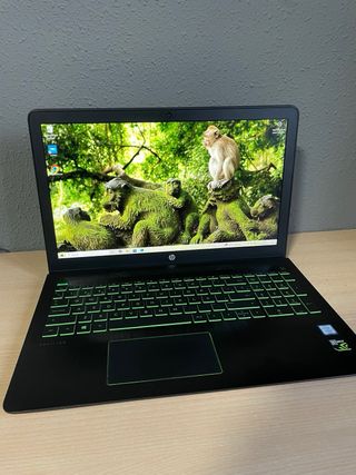 Laptop HP Pavilion con un design moderno e accattivante. - Tastiera retroilluminata verde. - Finitura esterna nera. - Schermo con sfondo di natura e scimmie.