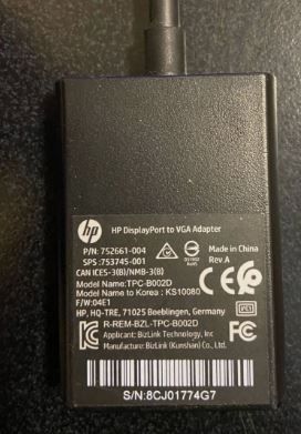 Nostro riferimento: 280425/001. Adattatore Display Port-VGA femmina HP. TPC-B002D. Adattatore Display Port-VGA femmina HP. Connettore A: Display Port. Connettore B: VGA femmina. Lunghezza cavo: 19cm. Colore: nero. Made in China. Rev.A. Oggetto usato non fatturabile e/o scontrinabile in quanto affidatoci per la vendita da un soggetto privato. In confezione non originale non sigillata.
