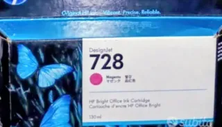 Set di 5 cartucce d'inchiostro HP Designjet 728 n.5 Cartucce HP728: n. 1 F9J62A magenta n. 2 F9J65A Yellow n. 1 F9J66A magenta n. 1 F9J67A ciano tutte le cartucce sono originali, scadute. n.3 sono sigillate, senza scatola di cartone. prezzo 125,00 euro per tutte e 5.