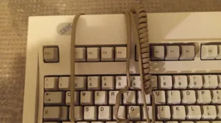 Tastiera per computer IBM in bianco. Design classico, cavo a spirale.