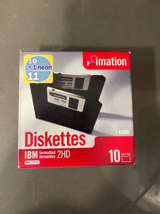 Confezione di 11 dischetti Imation da 1.44MB, formattati per IBM 2HD. Include 1 dischetto di colore neon. - 10 dischetti standard. - 1 dischetto di colore neon. - Formato 2HD. - Capacità 1.44MB. - Prodotto negli Stati Uniti.