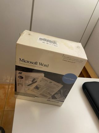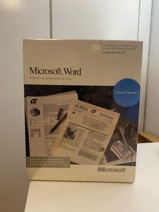 Programma di elaborazione testi Microsoft Word Versione 5.0. Per IBM PC e compatibili, e serie IBM Personal System/2. Include dischi da 5 1/4. Consente l'inclusione di immagini grafiche nei documenti. Mostra pagine complete sullo schermo con tutti i loro elementi.