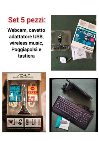1- Tastiera compatta "Logitech" con retroilluminazione. Usata pochissimo, come nuova. Piccolo neo: i piedini d'appoggio sono mancanti. 2- Poggiapolsi per scrivania. Nuovissimo 3-Comoda connettività audio stereo wireless per i sistemi stereo domestici. Usa lo stereo di casa per ascoltare musica da telefoni cellulari, PC e dispositivi bluetooth compatibili. Utilizzabile con auricolari bluetooth compatibili. Tutte le informazioni d'utilizzo si trovano all'interno della confezione.Nuovissimo. 4- Mini webcam 5- Cavetto adattatore 2 in 1 autoavvolgente. Ricarica e trasferimento dati. Riduttore micro USB e lightning.