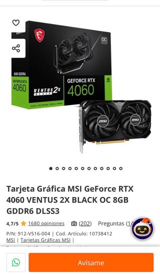 Scheda grafica MSI GeForce RTX 4060 con 8GB di memoria GDDR6, ha un anno e mezzo di utilizzo, ha ancora la garanzia fino a marzo e ho la fattura, funziona perfettamente, accetto offerte