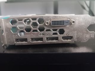 Scheda grafica MSI GeForce GTX 1060 con 3GB di memoria. Design a doppio ventilatore per un raffreddamento efficiente. Connettori DisplayPort, HDMI e DVI. Tre delle quattro linguette che fissano i ventilatori si sono rotte ma sono state riparate. Funziona perfettamente