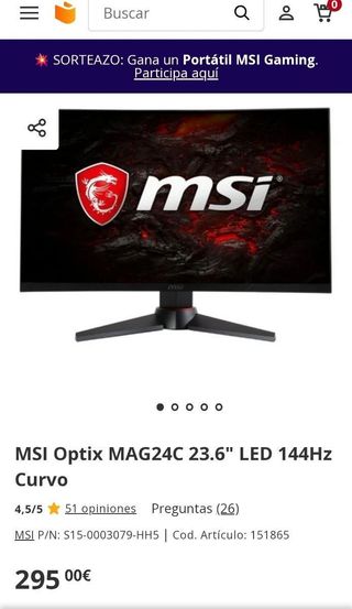 Monitor MSI Optix G24C4 da 23,6'' FullHD 144 Hz con FreeSync in ottime condizioni, come nuovo, usato solo 2 anni. Funziona perfettamente, senza segni né difetti. Ideale per il gaming o per completare il tuo PC da gioco questo Natale. Monitor curvo MSI Optix G24C4 con schermo LED da 23,6 pollici. - Risoluzione FullHD. - Frequenza di aggiornamento di 144Hz. - Tecnologia FreeSync.