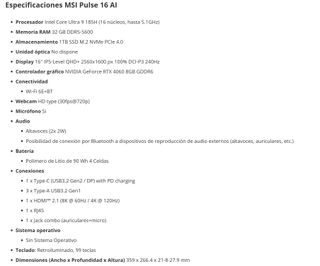 Portátil MSI Pulse 16 AI con processore Intel Core Ultra 9. Questo dispositivo si distingue per il suo design moderno e la sua potenza. - Schermo con grafica NVIDIA GeForce RTX. - Nessun sistema operativo Windows preinstallato. - Include caricatore USB PD da 225-240W.