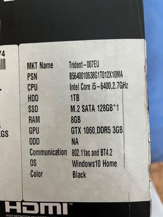 Vendo PC MSI Trident in perfette condizioni. - Processore Intel Core i5-6400 a 2.7GHz - 8GB di RAM - Hard disk da 1TB - SSD M.2 SATA da 128GB - Scheda grafica GTX 1060 con 3GB di VRAM DDR5 - Sistema operativo Windows 10 Home Sono inclusi la tastiera meccanica Mars Gaming e il microfono con braccio che si vedono nelle foto