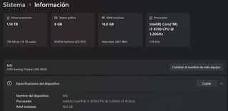 💻 Informazioni sul sistema Produttore / Modello: MSI H310 Gaming Trident 3 (MS-B920) ⚙️ Specifiche principali Processore (CPU): Intel® Core™ i7-8700 Frequenza base: 3,20 GHz Core: 6 Thread: 12 Architettura: Coffee Lake (8ª generazione Intel Core) Memoria RAM: 16,0 GB DDR4 Velocità: 2667 MHz Scheda grafica (GPU): NVIDIA GeForce GTX 1070 Memoria video: 8 GB GDDR5